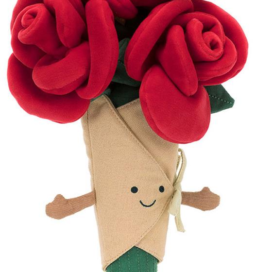 Amuseables Rose Bouquet is the floral gift that keeps on giving. A trio of soft red roses in full bloom with green suedette leaves and stems with stitched detail are wrapped up in beige linen. Tied with a ribbon and wearing an embroidered smile, this wrap has fine cord arms wide for thorn-free cuddles.
