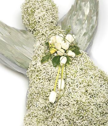 An angel wreath created with white Roses, Tulips and Gypsophila.