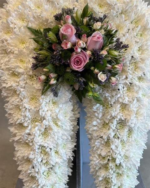 Our handcrafted Angel Wings tribute is a graceful and heartfelt expression of love and remembrance. Carefully created using delicate chrysanthemum blooms to form beautifully sculpted wings, this elegant design features a bespoke floral spray at its heart. The central spray can be fully customised in your choice of colours and flowers, allowing you to create a deeply personal and meaningful tribute that truly reflects your loved one.