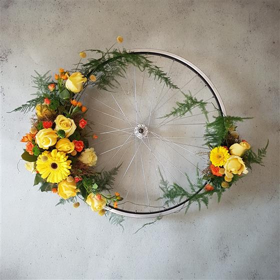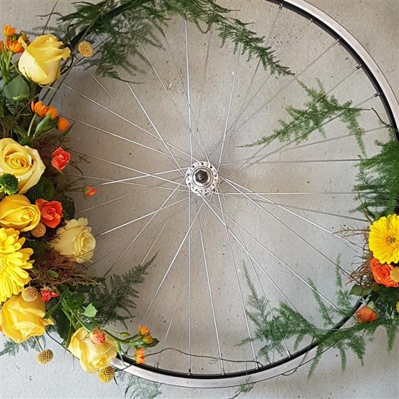 Beautiful Bicycle wheel with cluster of flowers in choice of your colours. Perfect for those who loved to cycle.