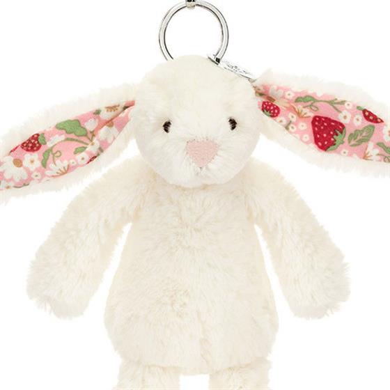 Blossom Cream Bunny Bag Charm has been hopping around the garden. This pocket-sized Blossom Cream Bunny is soft in iconic Bashful fur, and has soft cotton ears, printed with an original Jellycat design of juicy strawberries and cream flowers on a pink backdrop. Use the silver clasp to attach bunny to any bag for the perfect outdoor adventure companion.