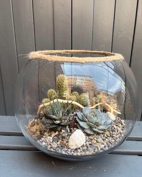 Glass fish bowl terrarium filled with a selection of succulent and cactus plants, creating a modern, low‑care display. Perfect for indoor styling, this compact terrarium adds texture, interest, and greenery to any home.