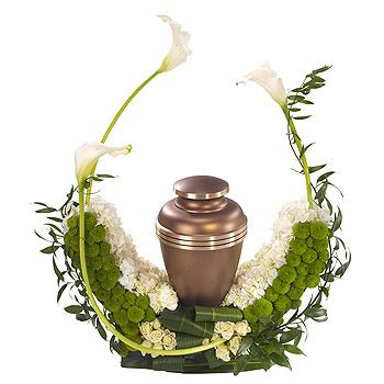 An elegant white crescent creates a beautiful focal point for an urn. White Hydrangea and Calla Lilies are the feature with spray Roses and green spray Chrysanthemums. Urn not included.