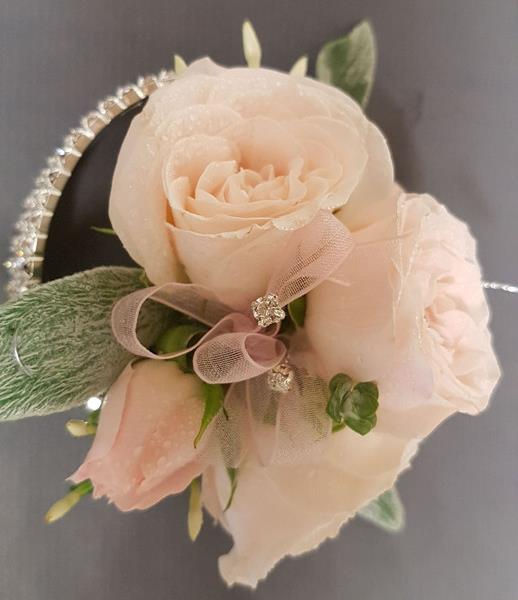 Every girl loves diamante's, a wrist corsage on a diamante bracelet with flowers to match the dress. Picture is a pale pink roses.