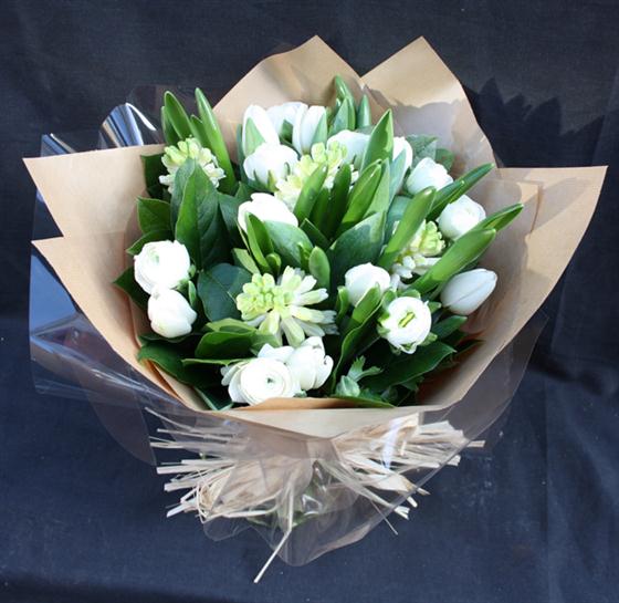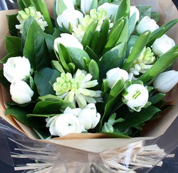 A dreamy mix of white tulips, white hyacinth, ranunculas and seasonal foliages.