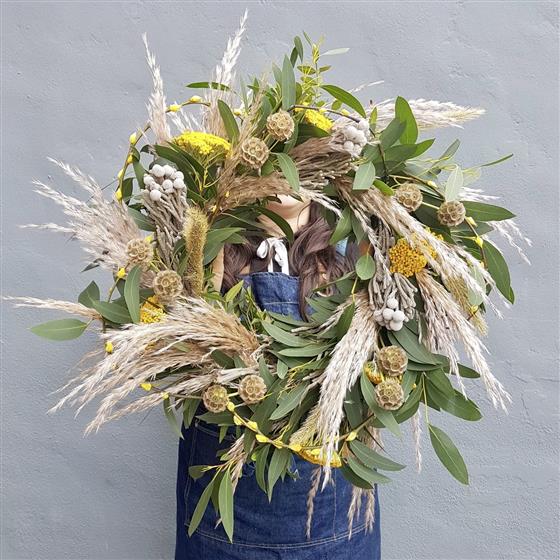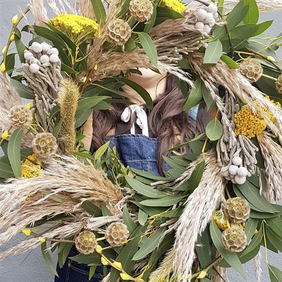 Our spring wreath is here! Created on a wire frame and foliaged base. Finished with various spring flowers and dried accessories.