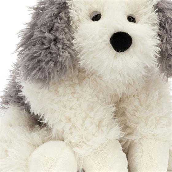 Normally only little dogs sit on laps, but we'll make an exception for Floofie Sheepdog! This tumbly cloud of scruffled softness is too adorable not to hug! With tussled vanilla fur, flopsy grey ears, ice-cream paws and a bobbly black nose, our perky pup is always making friends
