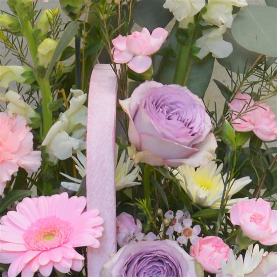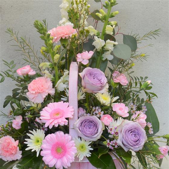 A beautiful modern basket arrangement in a pink wooden trug. This design includes Antirrhinums, lilac lullaby roses, delicate pink spray carnations and lemony wax flower.