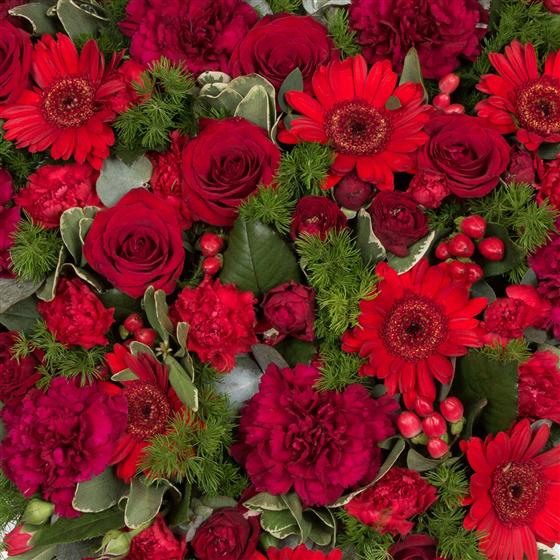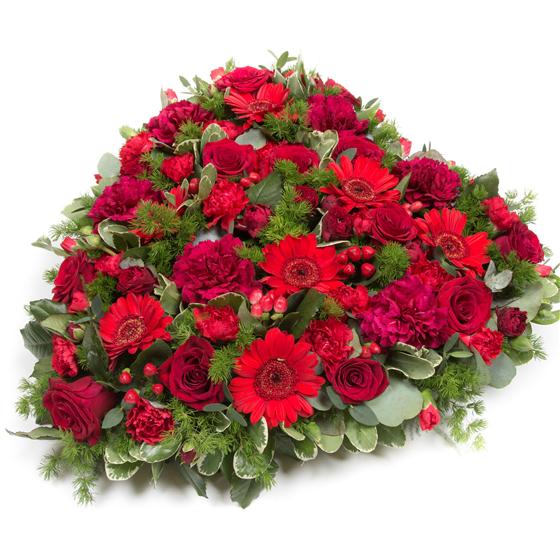 A heart tribute filled with seasonal flowers and a colour of your choice, includes roses