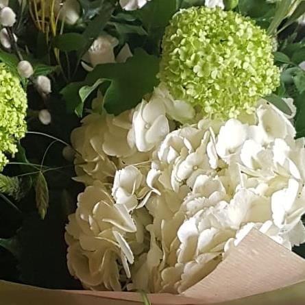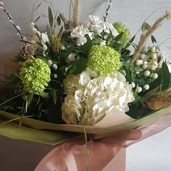 A beautiful mix of white and green country style flowers with lots of seasonal foliages, including touches of dried grasses.