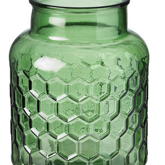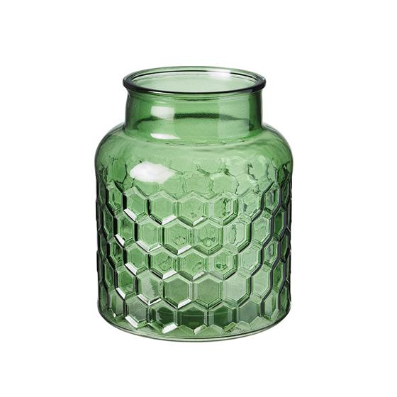 This hexagon honeycomb effect green tinted glass vase is a great size for a handtied bouquet, lovely all year round, change with the seasons.