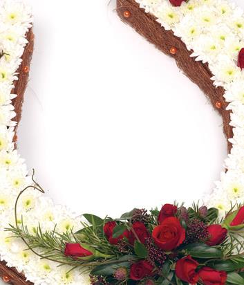 A lovely white horse shoe shaped Chrysanthemum based tribute with red Rose detailing.