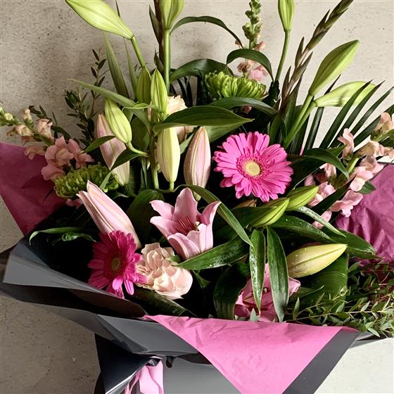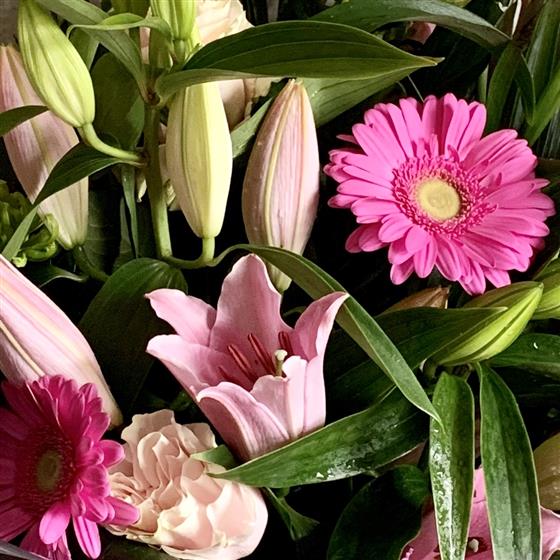 A beautiful mix of pink oriental Lilys, longiflorum lilys, blush pink roses, pink Gerbera's, pink snap dragons, and lush foliages.