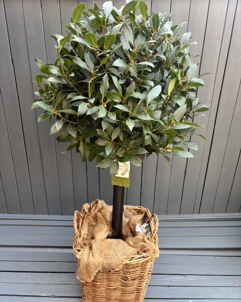 Large laurel tree with dense evergreen foliage, beautifully displayed in a woven wicker basket. Perfect for doorways, patios, and gardens, this low‑maintenance statement tree provides year‑round greenery and timeless appeal.