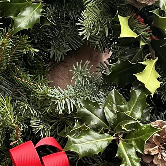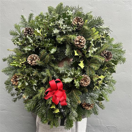 Each wreath is designed with care to reflect peace, love, and remembrance. The natural greenery is full and long-lasting, symbolising eternal life, while the addition of holly and pine cones brings traditional Christmas warmth. The wreath is beautifully finished with a classic red bow, adding a respectful yet festive touch to your graveside tribute.