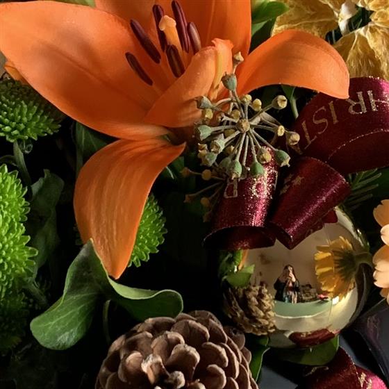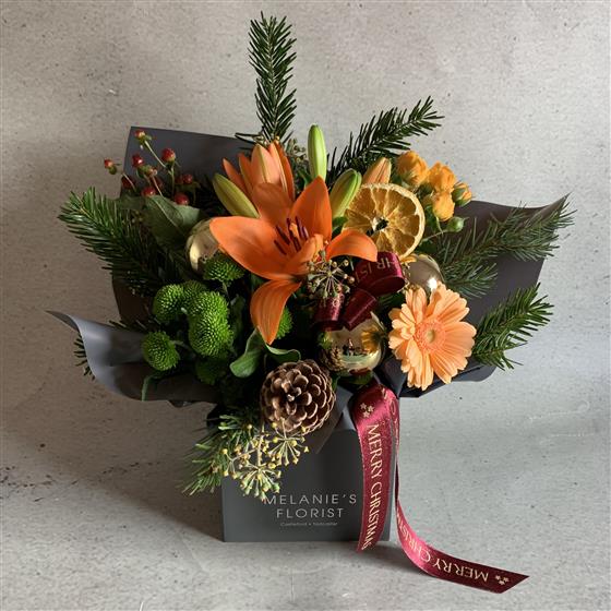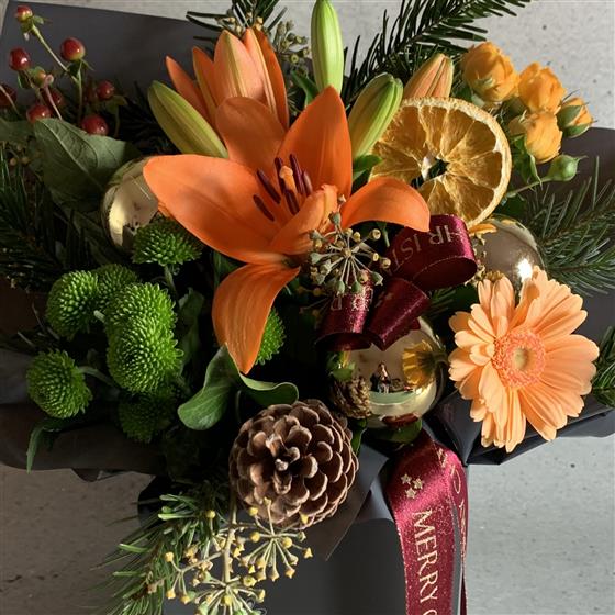 Brighten someones christmas with this sweet mixture of rustic orange seasonal flowers, complete with scented orange slices and a festive bauble. Comes freshly arranged in oasis, inside one of our signature boxes.