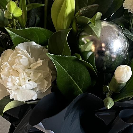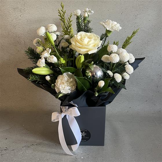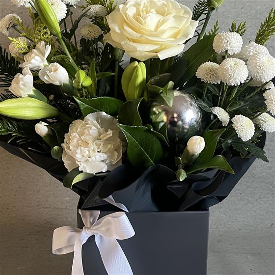This elegant winter arrangement features a beautiful mix of lilies, roses, chrysanthemums, and carnations, complemented by festive foliages. Carefully arranged in foam, it is finished with Christmas-themed wrapping and adorned with silver baubles, adding a sparkling festive touch. Perfect as a holiday gift or a stunning centerpiece to brighten up any home this season.