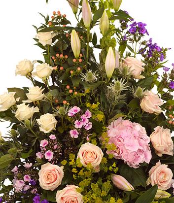 A luxurious pastel arrangement featuring pink and cream Roses, pink and purple Phlox, pink Lilies and Hydrangea with a generous array of foliage.