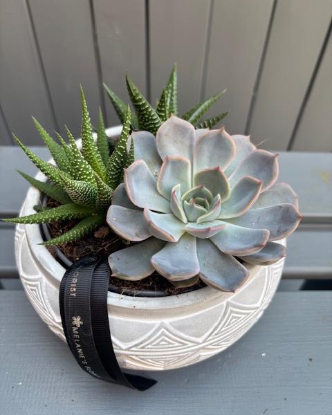 Mixed succulent arrangement with an Echeveria rosette and Haworthia plants, beautifully presented in a textured ceramic pot. Ideal for indoor styling, this easy‑care display offers architectural foliage, texture, and lasting greenery.