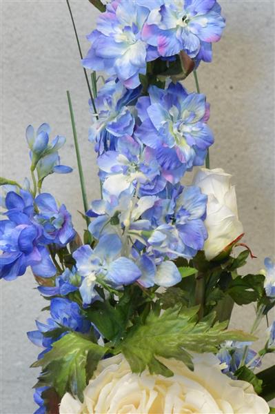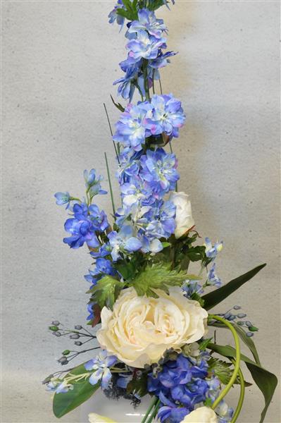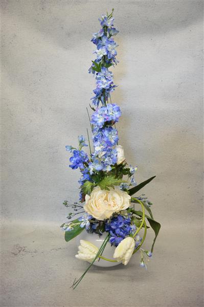 Cool blue arrangemnt with delphiniums and white tulips