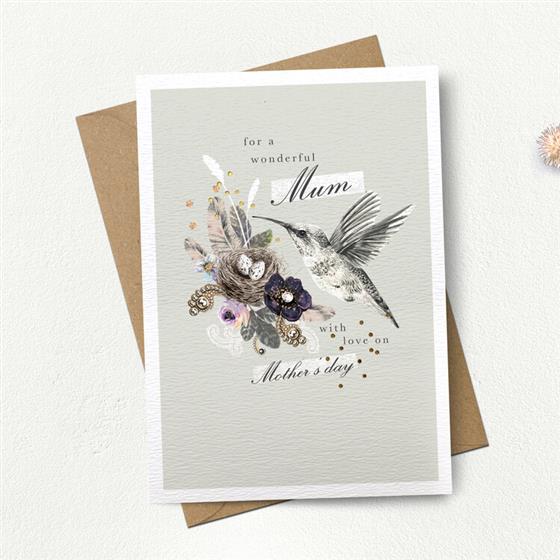 This greetings card features an illustrated hummingbird and nest with the caption ‘For a wonderful Mum with love on Mother’s day’. This card is hand stamped with foil and embellished with a crystal to add a touch of luxury.
