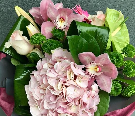 A compact arrangement,in shades of your choice, includes roses, orchids,Hydrangea(when available) and rolled leaves.