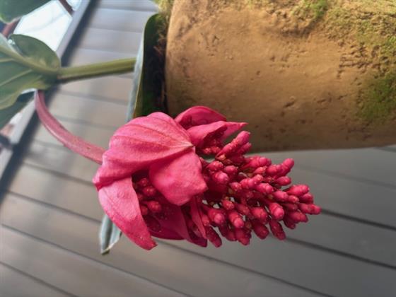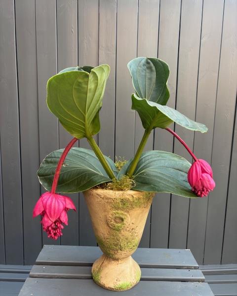 Pink Medinilla magnifica with dramatic cascading flowers, beautifully presented in a unique antique pot. Ideal for windowsills, side tables, or as a statement table centrepiece, this stunning indoor plant adds colour, texture, and elegance to your home.