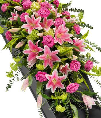 A gorgeous pink Rose and Lily casket spray with Hydrangea and Viburnums interspersed with Aralia, Eucalyptus and striking variegated lime Dracaena leaves.