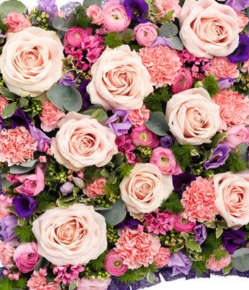 A beautiful pink, mauve and purple cushion featuring pink Roses, Ranunculus, Bouvardia and Carnations with lavender and purple Lisianthus. A mix of Eucalyptus, Ming Fern and variegated Pittosporum completes the design.