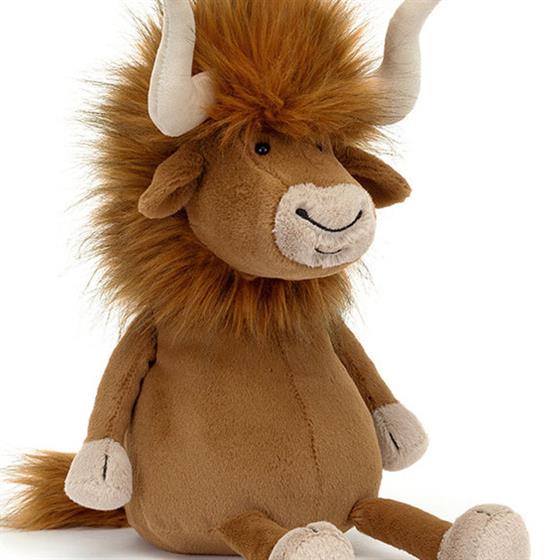 Ramone Bull has a wild mane of silky fur in ginger and charcoal. This sturdy bull has beige suedette horns, a cinnamon tum and a tassel tail. Ramone's got a huge stitched nougat nose and matching cloven hooves.