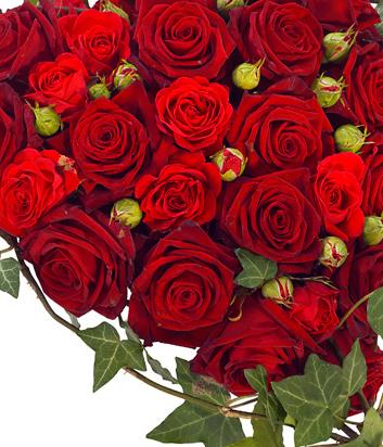 A stunning, classic red Rose heart shaped tribute with a flourish of Ivy.