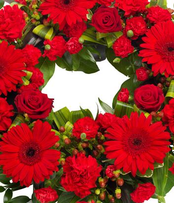 A bright red wreath featuring Roses, Gerbera and Carnations with a mix of lusciuous green foliage.