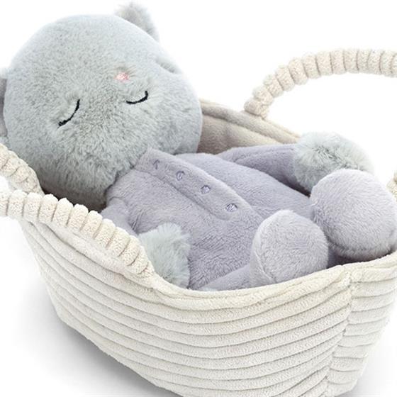 Deary me! Rock-a-Bye Kitten just can't stay awake! Time to hop into that cosy oatmeal basket, with chunky rumples and a soft suedey lining. This gentle grey poppet wears a lavender onesie with a fluffy tail just peeking out! Tuck this tiny pal in for sweet snuffly dreams.