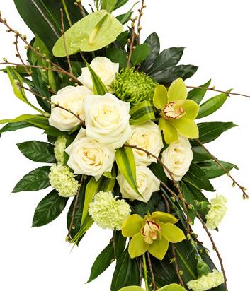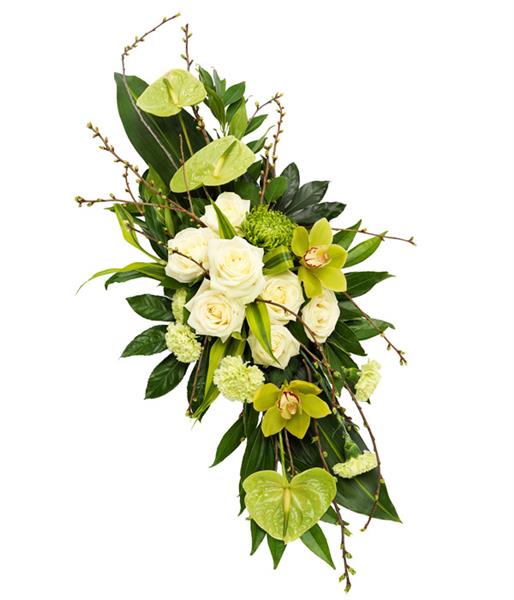 A beautiful white Rose and green Cymbidium Orchid double ended spray with green bloom Chrysanthemums, Anthuriums and Carnations.