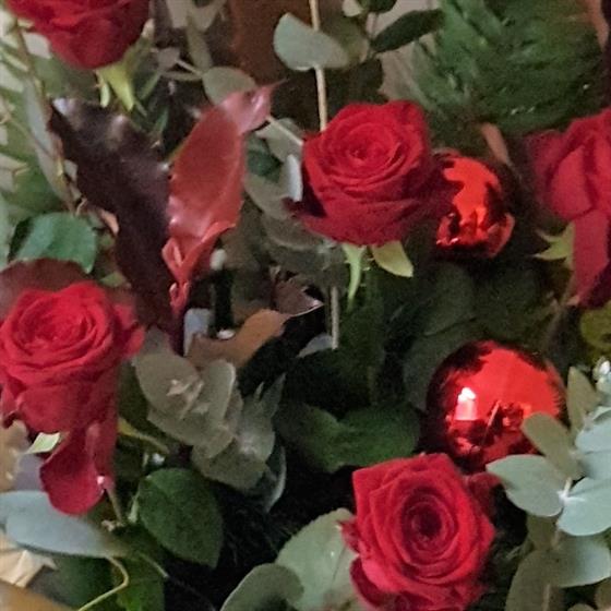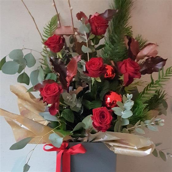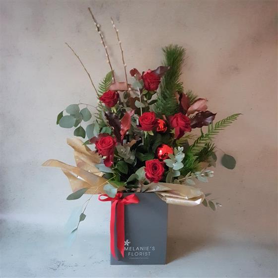 A romantic festive bouquet of red roses and sumptuous foliages, finished with baubles and presented in our special Christmas wrapping.