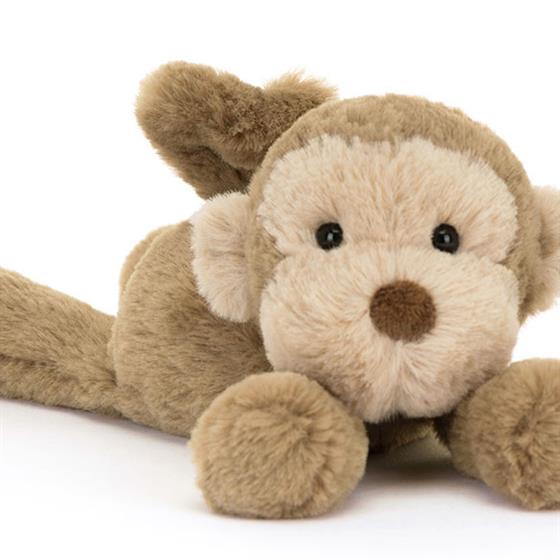 Smudge Monkey has such scrummy fur, with milk-chocolate paws and a nuzzly nougat face. This sleepy scamp loves to drop and flop onto those chunky monkey paws. This fluffy friend is jungles of fun! Limited availability of Tiny Size.