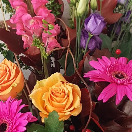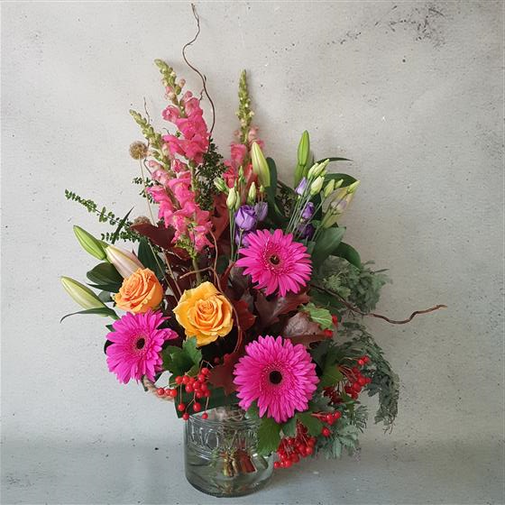A modern twist on a rustic vase arrangement. A front facing design which in vibrant colours, which includes gerberas and roses and seasonal foliages. Delivered in a vase. Vase may vary to the picture shown.