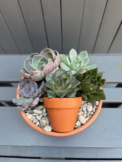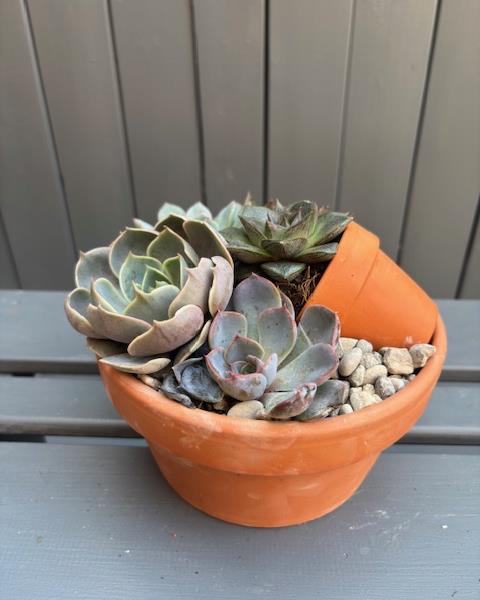 Succulent planter arrangement featuring a broken terracotta pot design, showcasing layered planting for a striking visual effect. Perfect for adding texture and creative interest to interiors or sheltered garden areas.
