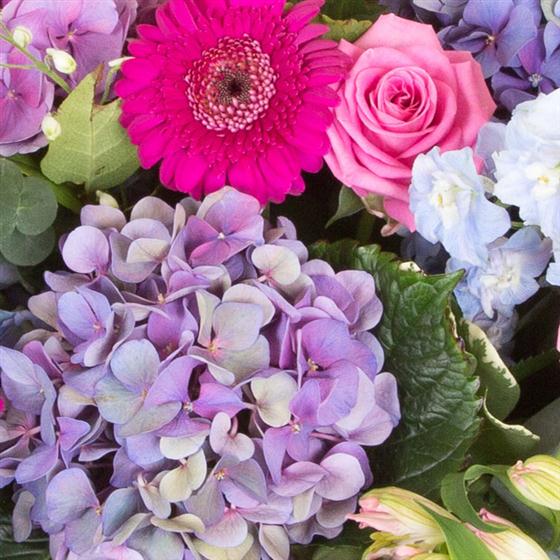 A beautiful, feminine, garden style casket spray in summer blues, pinks, lilacs, and purples. This pretty spray includes delphinium, hydrangeas, roses,mini gerberas and alstromeria.
