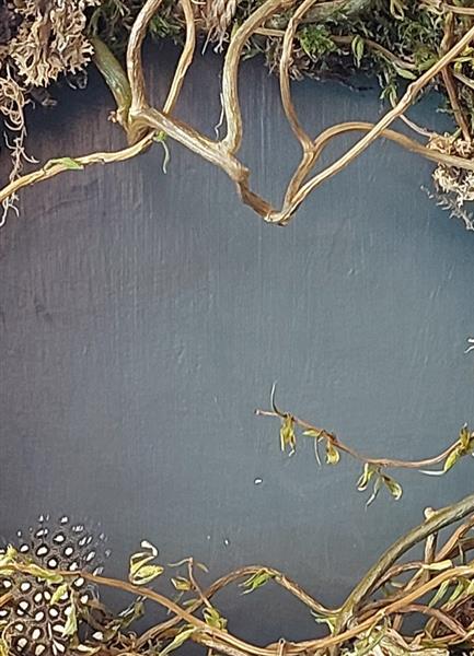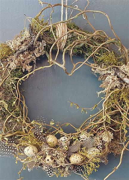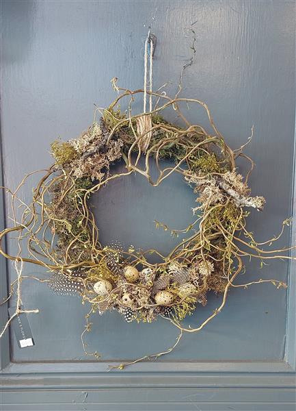 Natural Easter wreath made up of twisted willow, lichen, feathers and eggs.