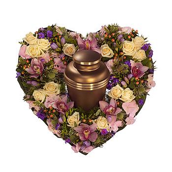 A delicately fragrant heart shaped urn wreath featuring cream Roses, purple Phlox and Freesia, pink Hypericum, Cymbidium Orchids and Hydrangea with a touch of white Eryngium. Urn not included.